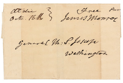 83 x 130 mm folded, manuscript "Aldi, Octr. 16th" postmark, Monroe's wax seal mostly intact on verso, note in another hand, center portion slightly toned.