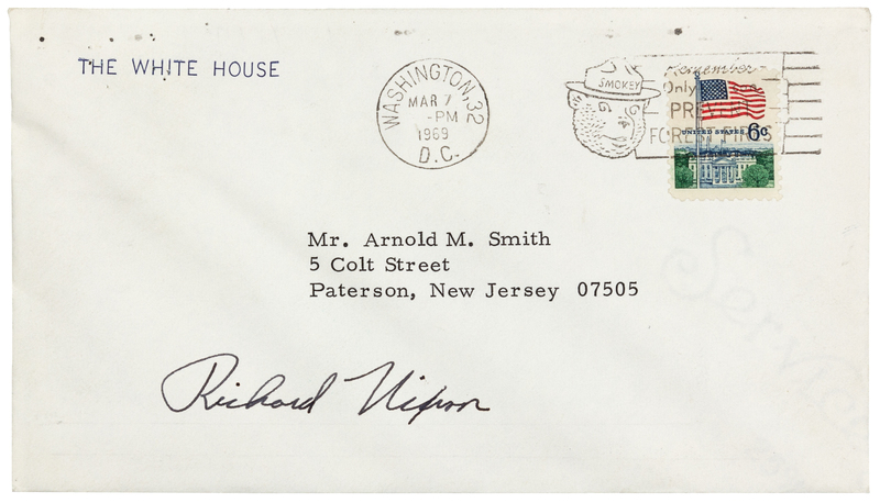 NIXON, Richard M. (1913-1994), President. Signature ("Richard Nixon"), as President. To Mr. Arnold M. Smith, Paterson, NJ, postmarked Washington D. C., 7 March 1969.