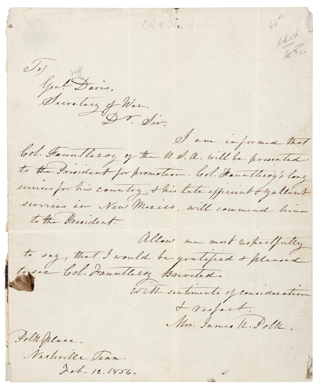 POLK, Sarah Childress (1803-1891), First Lady. Autograph letter signed ("Mrs James K. Polk"), Polk Place, Nashville, TN. To General Jefferson Davis, Secretary of War, 12 February 1856.