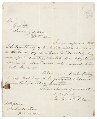 1 page, 4to, marginal ink stain, minor edge flaws. "I am informed that Col. Fauntleroy of the U. S. A. will be presented to the President for promotion. Col. Fauntleroy's long services for his country & his late efficient & gallant services in New Mexico will commend him to the President."