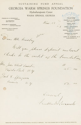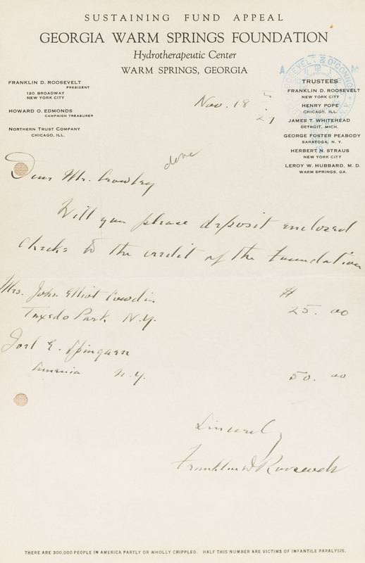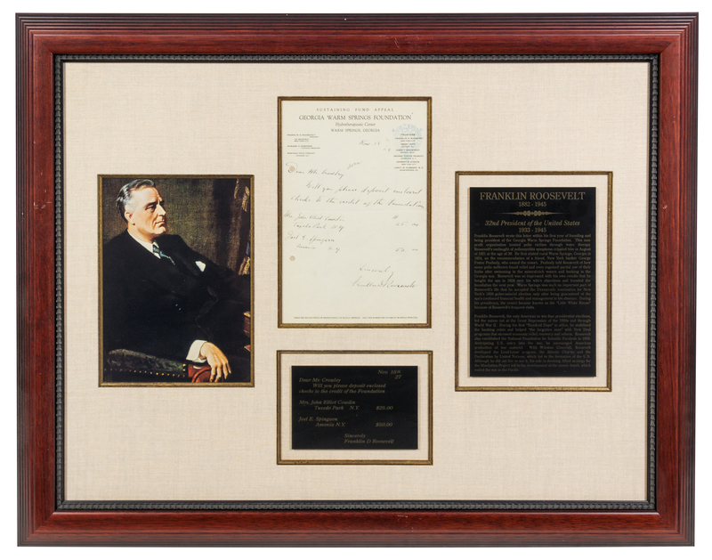 CLEVELAND, Grover (1837-1908). Autograph letter signed ("Grover Cleveland"), as former President and President-Elect, to Sidney Webster. New York, 7 January 1893. 3 pages, 8vo, on a bifolium, on personal stationery. Arranging a visit, and discussing his busy schedule in the face of the Treasury crisis, the Panic of 1893: "I hardly think in present circumstances that it would be well for me to do as you suggest though I am very anxious on the subject and am doing all I prudently can, as it seems to me, in the direction a better silver condition…" -- EISENHOWER, Dwight D. (1890-1969). Typed letter signed ("Ike") with autograph postscript signed ("D"), to Mr. and Mrs. Lewis L. Strauss, Gettysburg, Pennsylvania, 19 October 1966. 1 page, 4to, on personal stationery, creased at folds; matted and framed. Eisenhower's post-script to his friend reads: "To Lewis - I shall obey your orders about refraining from refraining from writing a letter about my favorite Scotch." -- HARDING, Warren G. (1865-1923). Typed letter signed ("W. G. Harding"), to Hon. William E. Mason. Marion, Ohio, 16 July 1920. 1 1/2 pages, 8vo, written on recto and verso on United States Senate letterhead, spotted, smudge in margin on first page, mounting remnants on verso, pencil note (in an unknown hand) with reply date in upper margin. Harding writes the Congressman (and former Senator) from Illinois discussing his upcoming acceptance speech after receiving the Republican nomination for President at the June convention in Chicago. -- ROOSEVELT, Franklin Delano (1882-1945). Autograph letter signed ("Franklin D. Roosevelt"), to Mr. Crowley. Warm Springs, Georgia, 18 November 1921. 1 page, 4to, on Georgia Warm Springs Foundation letterhead, pencil notation in recipient's hand, holes punched in left margin just touching first letter of salutation; mats and frames available. Enclosing checks for Georgia Warm Springs Foundation (not present here).