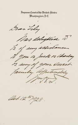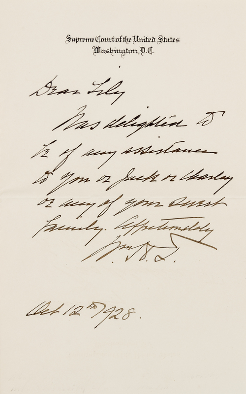 CHASE, Salmon P. (1808-1873). Autograph letter signed ("S.P. Chase"), as Governor of Ohio, to Hon. R.P. Ranney, Columbus, Ohio, 17 November 1856. 1 page, 8vo, on State of Ohio, Executive Department, Columbus stationery, remnants from hinging on verso. Chase, then Governor of Ohio, responds to a letter of resignation from eminent Cleveland jurist, R.P. Ranney. -- FRANKFURTER, Felix (1882-1965). Autograph letter signed ("Felix Frankfurter"), to Harry, Cambridge, n.d. 1 page, 8vo, on 22 Queen Anne's Gate, Westminster stationery, central fold, some light offsetting. Frankfurter was appointed Associate Justice of the Supreme Court by Franklin D. Roosevelt from 1939-1962. In 1920, he helped found the American Civil Liberties Union (ACLU). -- TAFT, William Howard (1857-1930). Autograph letter signed ("Wm. H.T."), as Chief Justice of the Supreme Court, to Lily. Washington, D.C., 12 October 1928. 1 page, 8vo, bifolium, on Supreme Court stationery, very faint pencil marks lower margin, creased. Taft, who twice turned down Theodore Roosevelt's offer of an appointment as Associate Justice of the Supreme Court, was appointed Chief Justice by Warren G. Harding in 1921.