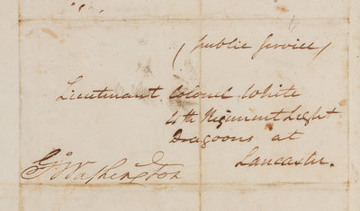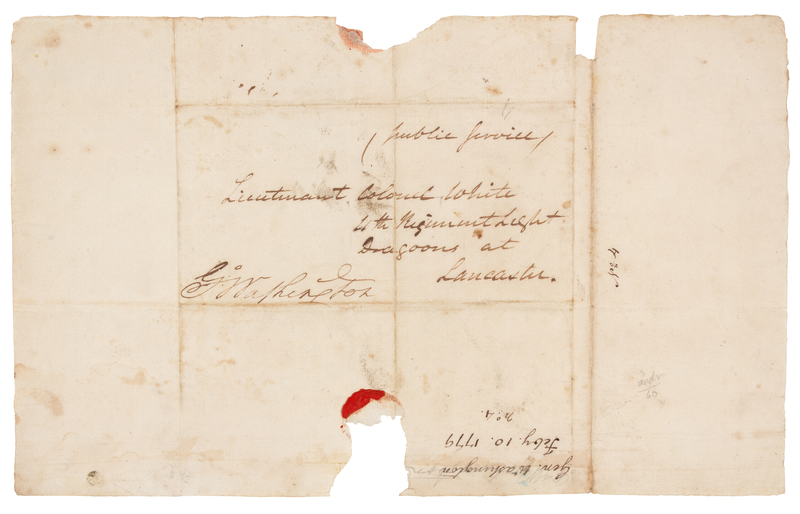 WASHINGTON, George (1732-1799), President. Autograph free frank ("G:o Washington"), as Commander-in-Chief of the Continental Army. An address panel to "Lieutenant Colonel White, 4th Regiment Light Dragoons Lancaster" [Anthony Walton White], 10 February 1779.