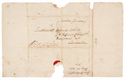 210 x 340 mm, addressed and docketed in two different hands, portion of Washington's red seal present, paper loss from wax seal, short tear along fold with small loss.