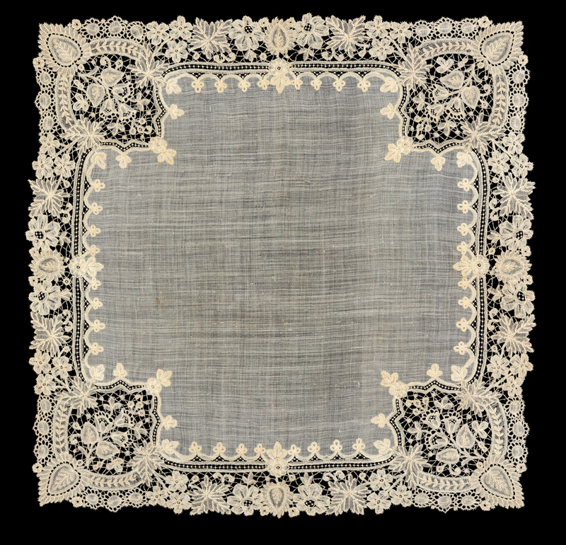 Square linen handkerchief, wide handmade lace border, 14 1/8 x 14 1/4 in.