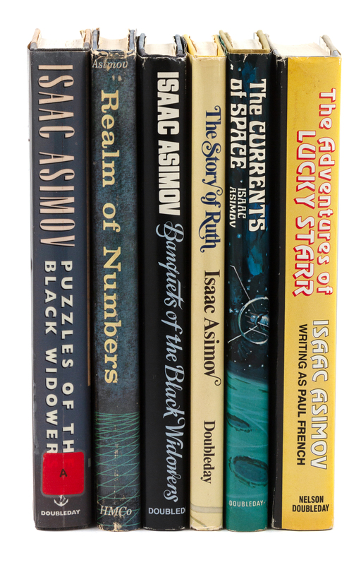 The Currents of Space. New York: Doubleday & Company, Inc., 1952. Provenance: Jay W. Driskell (signature). -- Realm of Numbers. Boston: Houghton Mifflin Company, 1959. SIGNED BY ASIMOV. -- The Story of Ruth. Garden City, New York: Doubleday & Company, Inc., 1972. FIRST EDITION. -- Banquets of the Black Widowers. Garden City, New York: Doubleday & Company, Inc, 1984. FIRST EDITION, FIRST PRINTING. -- The Adventures of Lucky Starr. Garden City, New York: Nelson Doubleday, Inc., 1985. Provenance: Jay W. Driskell (signature). -- Puzzles of the Black Widowers. New York: Doubleday, 1990. FIRST EDITION. -- Together, 6 works in 6 volumes, all in original publisher's bindings and dust jackets, most FIRST EDITIONS, condition generally fine.