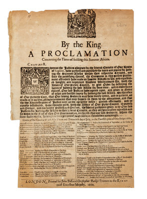 [BARKER, Christopher]. By the King a Proclamation Concerning the Times of holding this Summer Assizes. London: John Bill and Christopher Barker, 1660.