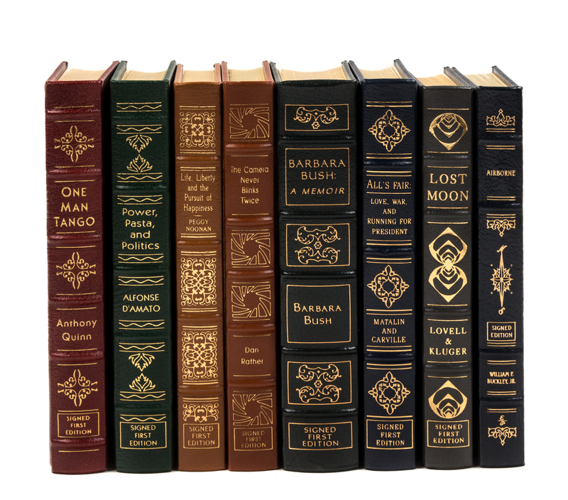 BUCKLEY, William F. Airborne: A Sentimental Journey. 2002. -- BUSH, Barbara. Barbara Bush: A Memoir. 1994. -- D'AMATO, Alfonse. Power, Pasta and Politics. 1995. -- LOVELL, Jim; KLUGER, Jeffrey. Lost Moon: The Perilous Voyage of Apollo 13. 1994. -- MATALIN, Mary; CARVILLE, James. All's Fair: Love, War and Running For President. 1994. -- NOONAN, Peggy. Life, Liberty and the Pursuit of Happiness. 1994. -- QUINN, Anthony. One Man Tango. 1995. -- RATHER, Dan. The Camera Never Blinks Twice. 1994. -- All in original leather, edges gilt, condition fine.