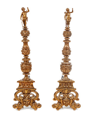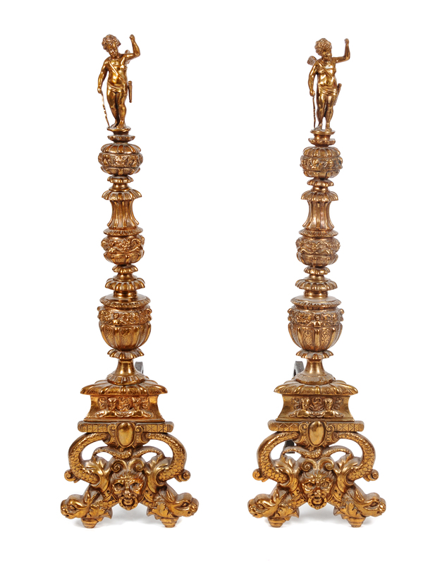 A Pair of Continental Gilt Bronze Andirons Height 47 inches.