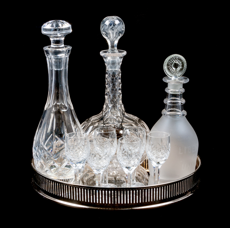 together with six Waterford cordials in the Lismore pattern and an Italian silver-plate tray, 10 items total.