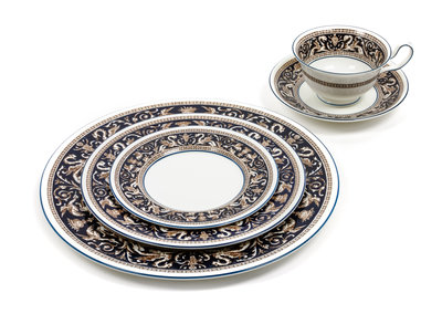 in the Florentine pattern, comprising 12 saucers, 24 bread plates, 12 salad plates, 12 teacups, and 12 dinner plates; 72 items total.