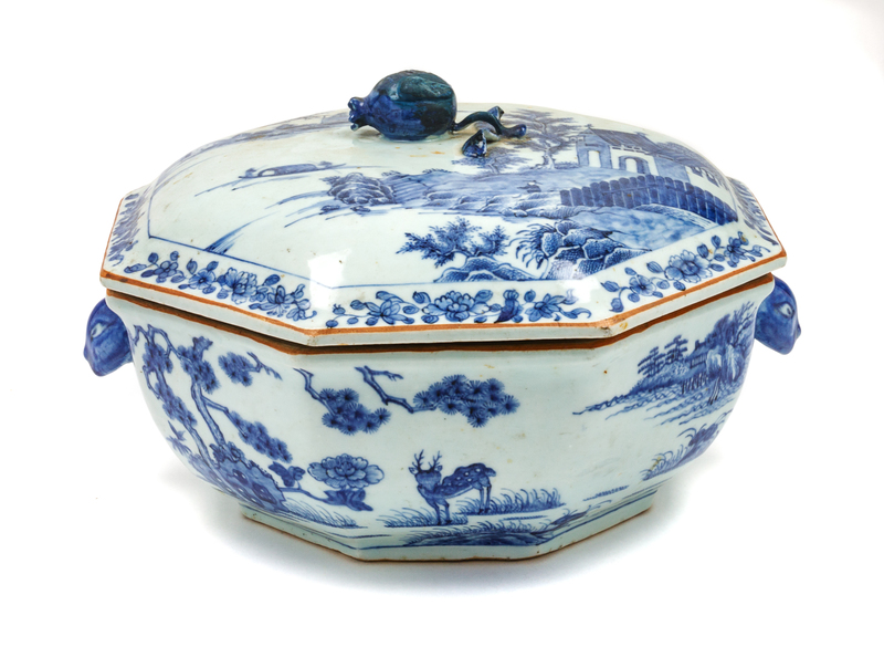 A Chinese Export Porcelain Lidded Tureen Height 8 x width 13 x depth 12 1/2 inches.