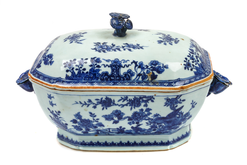 A Chinese Export Porcelain Lidded Tureen Height 9 x width 15 x depth 9 inches.