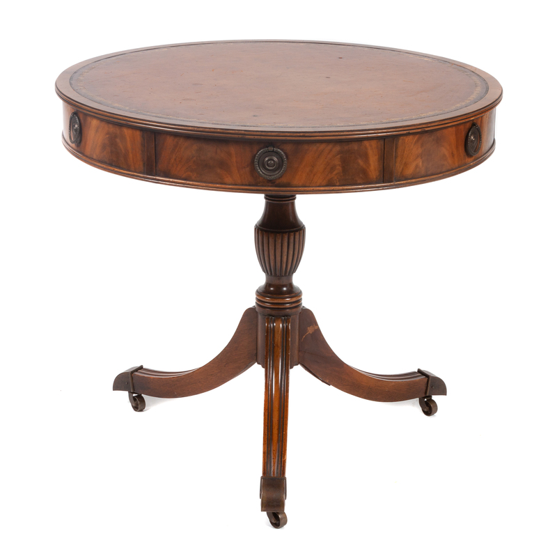 A Regency Style Mahogany Drum Table Height 26 3/4 x diameter 30 inches.