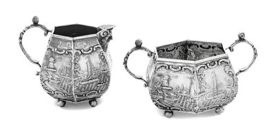 A Dutch Silver Creamer and Sugar Set, , each decorated with nautical scenes.