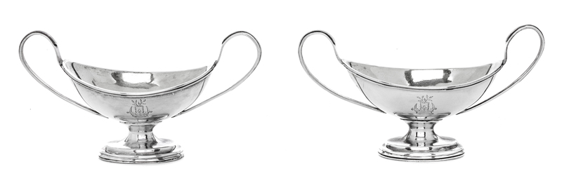 A Pair of English Britannia Silver Handled Bowls, London, 20th Century, with crest.