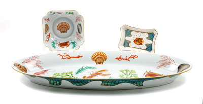 comprising 1 large oval serving platter, 1 small rectangular dish, 1 medium square bowl, in the Saint Tropez pattern.