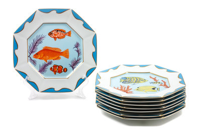 Eight Lynn Chase Porcelain Dinner Plates Diameter: 10 1/4 inches.