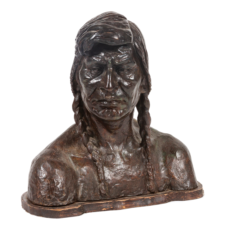 A Bronze Native American Bust Height 17 1/2 x width 17 1/2 x depth 8 inches.