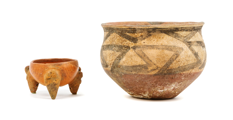 Two Pre-Columbian Style Pottery Articles Height of taller 6 x diameter 8 1/4 inches.