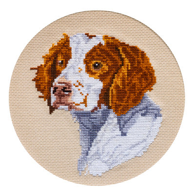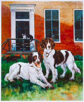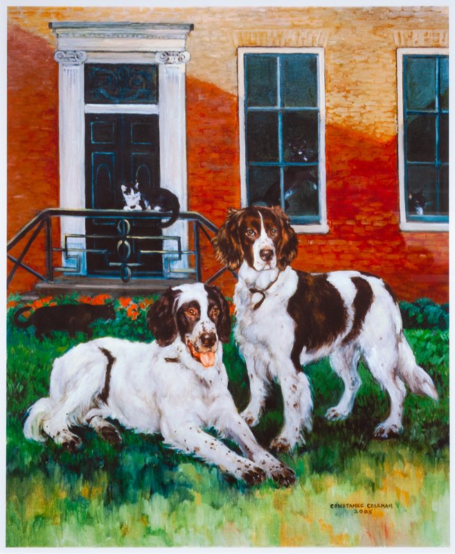 comprising a cross-stitch and Constance Coleman Two Spaniels and a Cat, 2005 giclee print.