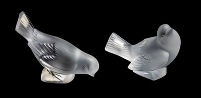 each depicting a sparrow, each signed Lalique France with sticker on underside.