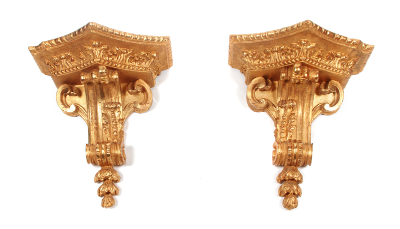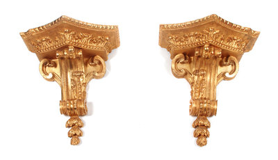 A Pair of French Giltwood Wall Brackets Height 19 x width 17 1/2 x depth 10 inches.