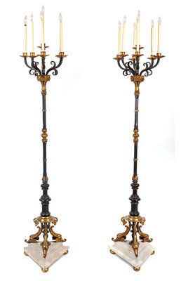 each with gilt metal elements, resting on marble bases, electrified.