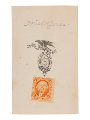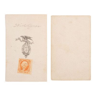 [With:] CDV, standing portrait of a gentleman identified in pencil on verso as "Will Jones." Waltham, MA: Henry F. Warren, ca 1865. Verso with Warren's imprint and 2-cent stamp initialed by the photographer, Henry F. Warren ("H.F.W.").