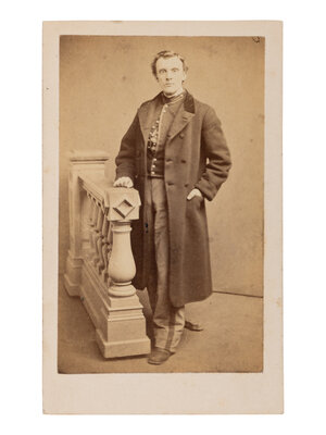 CDV on cardstock mount. Lacking a studio imprint but known to have been taken by Henry F. Warren of Waltham, MA, on 6 March 1865.