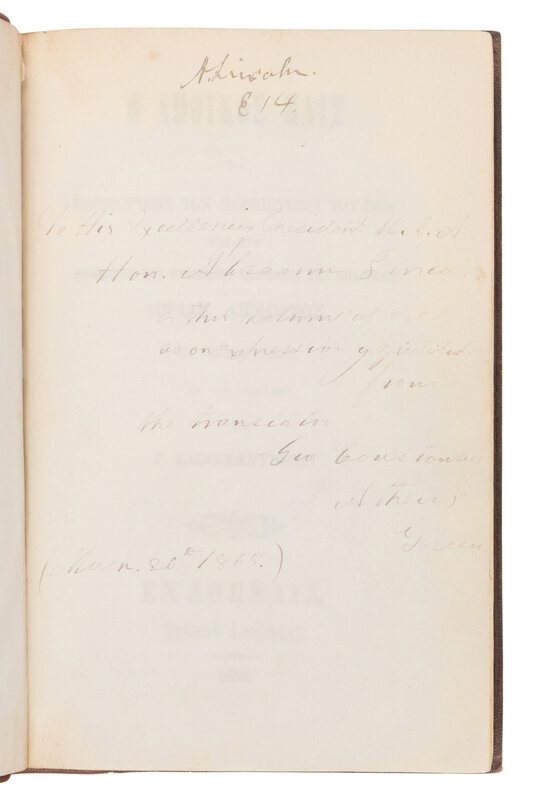 PRESENTATION COPY, INSCRIBED BY THE TRANSLATOR TO "HIS EXCELLENCY" ABRAHAM LINCOLN on the front flyleaf: "To His Excellency President U.S.A. Hon. Abraham Lincoln. In this volume, offered as an expression of gratitude from the translator, Geo. Constantine, Athens, Greece, (March 26 1865)."