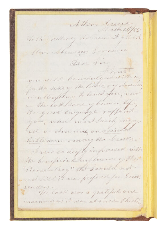 [Tipped in with:] Autograph letter signed ("Geo. Constantine") to "His Excellency...Abraham Lincoln," Athens, Greece, 24 March 1865. 3pp. on bifolium, 8vo, few small stains. PRESENTING ABRHAM LINCOLN WITH THE ABOVE BOOK. In part: "Dear Sir, I trust you will be indulgent with us, for the sake of the Bible & of America, in attempting to teach you, now on the last score of human life, the Greek language & appoint you, while most busily engaged in America, an assistant Bibleman among the Greeks. I was so deeply impressed with the beneficial influence of the 'Pioneer Boy' that I could not rest till it was prepared for Greek readers [...] Please [...] accept a copy of the "Pioneer Boy" as a specimen of the Greek edition, It is accompanied with our prayers, the greatest gift & the only one a Bible man can offer for his country & its President, at times like these."