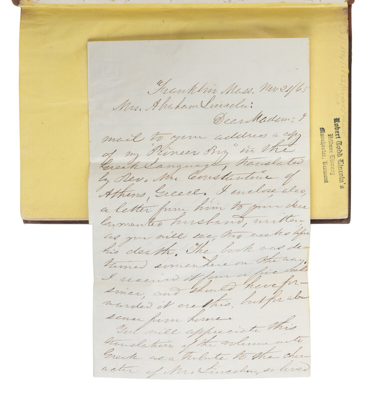 [Also tipped in with:] Autograph letter signed ("Wm M. Thayer"), to "Mrs. Abraham Lincoln," Franklin, MA, 21 November 1865. 2pp. on bifolium, 8vo, old folds. In part: "[...] I mail to your address a copy of my 'Pioneer Boy' in the Greek Language [...] I enclose, also, a letter from [Constantine] to your dear lamented husband, written as you will see, two weeks before his death [...] You will appreciate this translation of the volume into Greek as a tribute to the character of Mr. Lincoln, so loved by his countrymen, and so honored by the people of other lands. The thought of his exalted virtues cherished by the memories of all, must be a solace to you in your deep affliction."