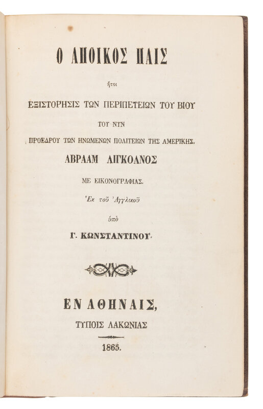 [LINCOLN, Abraham (1809-1865)]. -- THAYER, William M. (1820-1898). The Pioneer Boy [in Greek]. Translated by George Constantine. Athens: Typois Lakōnias, 1865.