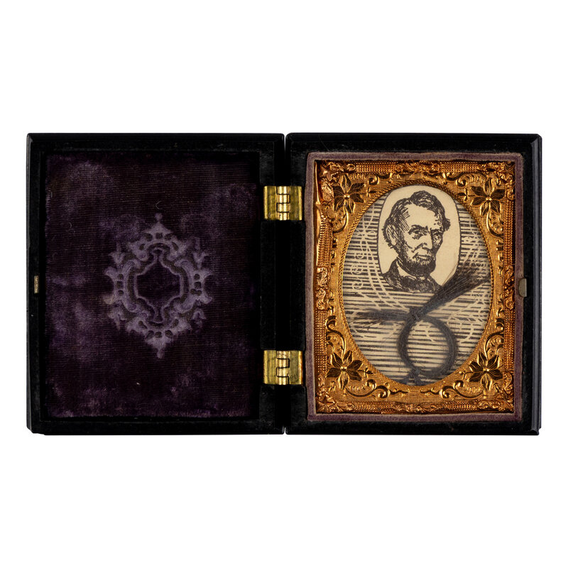 Housed in a late 19th-century gutta-percha daguerreotype case, with a later woodcut image of Lincoln. 3 x 2 1/2 in. (72 x 63 mm).