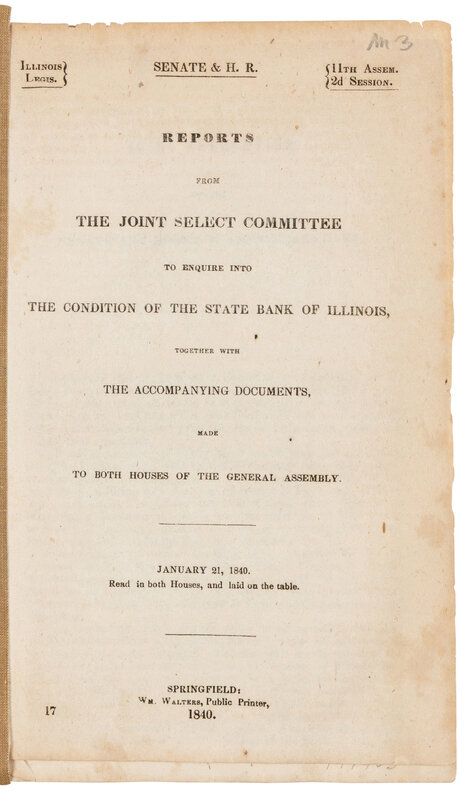 LINCOLN, Abraham (1809-1865). Reports from the Joint Select Committee to Enquire into the Condition of the State Bank of Illinois, together with the Accompanying Documents, Made to Both Houses of the General Assembly. January 21, 1840. Springfield: William Walters, 1840.