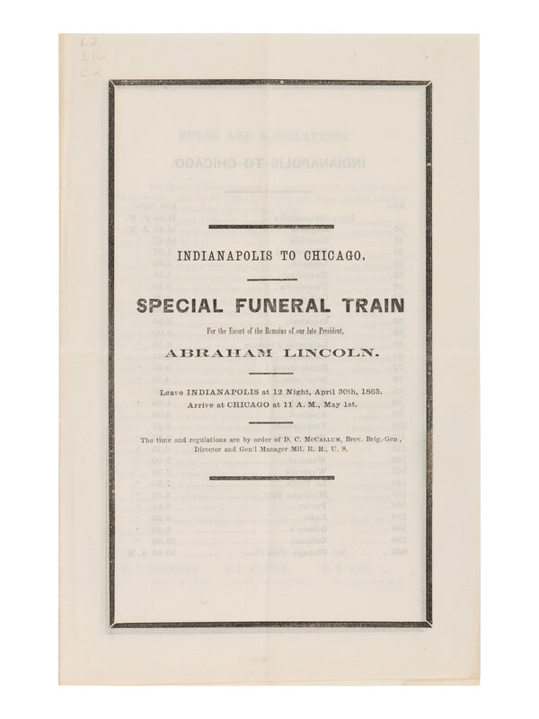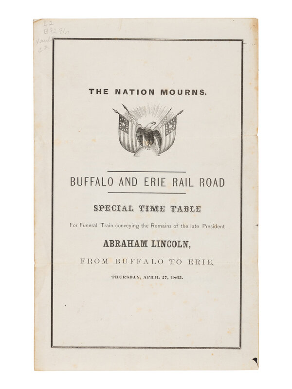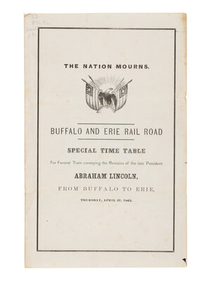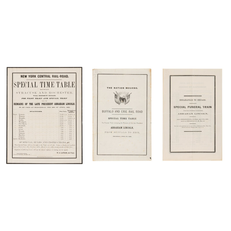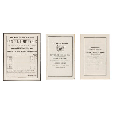 Indianapolis to Chicago. Special funeral train for the escort of the Remains of our late President, Abraham Lincoln. Leave Indianapolis at 12 night, April 30th, 1865. Arrive at Chicago at 11 a.m., May 1st. N.p., n.p., 1865. 8vo. Bifolium with mourning borders printed on all pages. (Old folds). -- New York Central Railroad. Special time table between Syracuse and Rochester via direct road. For pilot train and special train with the remains of the late president. To be used Wednesday, The 26th of April, 1865. Syracuse: Daily Journal Steam Print, 1865. 1p., bifolium. Printed broadside with mourning border (old folds). -- The Nation Mourns. Buffalo and Erie Rail Road special time table for funeral train conveying the remains of the late President Abraham Lincoln, from Buffalo to Erie, Thursday, April 27, 1865. N.p., n.p., 1865. 8vo. Bifolium with mourning border printed on recto and integral leaf, vignette on upper cover (old folds, spotting, some toning in gutter).