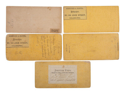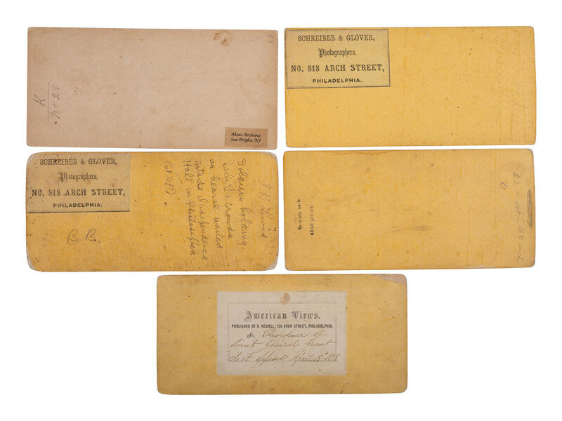 Includes: A view of the funeral procession, including the hearse completely surrounded by people, at the corner of Sixth and Chestnut Street. A large banner for "Head Quarters Maj. Gen. Hancock's 1st Army Corps" hangs from a building to the right and an overturned recruitment broadside rests on its side on the street below. Paper label on verso credits the view to Schreiber & Glover, Philadelphia. -- A view from nearly the same vantage point as the previous image, though with the "Chestnut St." sign in view to the left. The hearse is in nearly the same position, but a group of soldiers hold the crowds at a distance. Paper label on verso credits the view to Schreiber & Glover, Philadelphia. Pencil inscription also on verso reads, "Soldiers holding back the crowds as hearse waited outside Independence Hall in Philadelphia (at left)." -- A view of the hearse making its way along South Broad Street, surrounded by people on all sides, and with additional onlookers gathered on rooftops. Uncredited, though likely by Ridgway Glover. -- Another view of Broad Street, not showing the hearse but featuring a long row of soldiers and crowd of civilians awaiting the arrival of the funeral train. The soldiers are identified elsewhere as part of the 9th Union League. Uncredited though likely by Ridgway Glover. -- A view of a many-windowed building abundantly festooned with American flags and patriotic bunting. Identified on paper label on verso as the "Residence of Lieu't General Grant As it appeared April 15th 1865" and credited to R. Newell, Philadelphia. -- Together, 5 stereoviews.