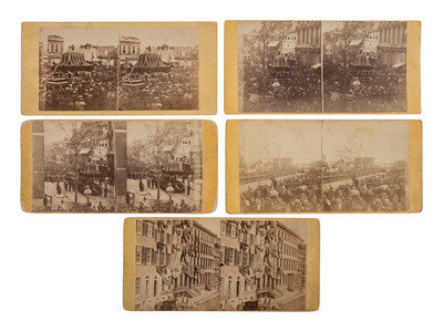 [LINCOLN FUNERAL]. A group of 5 stereoviews documenting the procession and buildings draped in mourning, Philadelphia.