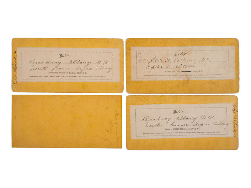 Includes: A frontal, street-level view of the State House draped in morning. Uncredited, but with pencil inscriptions identifying the scene on recto and verso. -- A view of State Street, with sidewalk dotted by a handful of early onlookers likely hoping to see a glimpse of the funeral procession upon its arrival. Haines's Paper label on verso numbers the view 49 and provides manuscript title: "State St. Albany N.Y. Capital[?] in distance." Multiple clocks hang from storefronts on the viewer's left. -- And 2 views of Broadway Street, showing offices and storefronts draped in mourning. Haines's paper labels number the views 51 and 52 respectively, and provide the same manuscript title for both: "Broadway Albany N.Y. North from Argus Building." Both views also feature ink inscriptions separate from paper labels on verso, likely from a previous owner, "Eliza R. James." -- Together, 4 stereoviews.