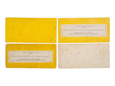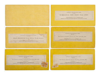3 views of the funeral procession on Broadway, making its way toward City Hall. Each taken from the same vantage point but at different times, featuring different parts of the parade. Each with Anthony's title "The Funeral of President Lincoln, New-York, April 25th, 1865" printed on paper label, and individually numbered 2950, 2952, and 2958, respectively. -- 2 views showing different sides of Broadway Street, with buildings draped in mourning. The first, numbered 2972 and titled "Up Broadway, From Below Wall Steet [sic]," the second, numbered 2974 and titled "Down Broadway from below Wall Street." -- 2 views from the same vantage point near Union Square, showing different parts of the funeral procession, the first numbered 4595 and titled, "Funeral of President Lincoln, N. Y. City. Regiment of Artillery passing in view." The other numbered 4956 and titled, "Funeral of President Lincoln, New-York city. 7th Regiment passing in view." Apparently the many-windowed building with large draped flag and columns wrapped in black was the house of Theodore Roosevelt's grandfather. In certain images from this vantage point (but not necessarily the ones featured here), a young Theodore and his brother, Elliot, can be seen looking out the second-story window. -- A view along the procession route showing several people watching the parade from the branches of a tree. Uncredited, but inked on verso, "City, Military on B. way, No. 345." -- A compelling view of crowds outside of the heavily draped and wrapped City Hall, with large letters spelling out "The Nation Mourns" prominently placed above the entrance. Uncredited. According to Twenty Days, this image was taken after Lincoln's coffin was carried up the steps and into the building, where his body would lie in state for viewing. -- An up-close view of the hearse, ornately decorated with black feathers, drapery, and flags. Uncredited by inked on verso, "Lincolns Catafalque, No 586." -- Together, 10 stereoviews.