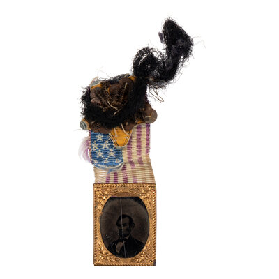 5) Ferrotype campaign badge repurposed as a mourning badge with a gold paper star sewn into the American flag ribbon and a black piece of fabric, ca 1864-65. Overall, 70 x 19 mm.