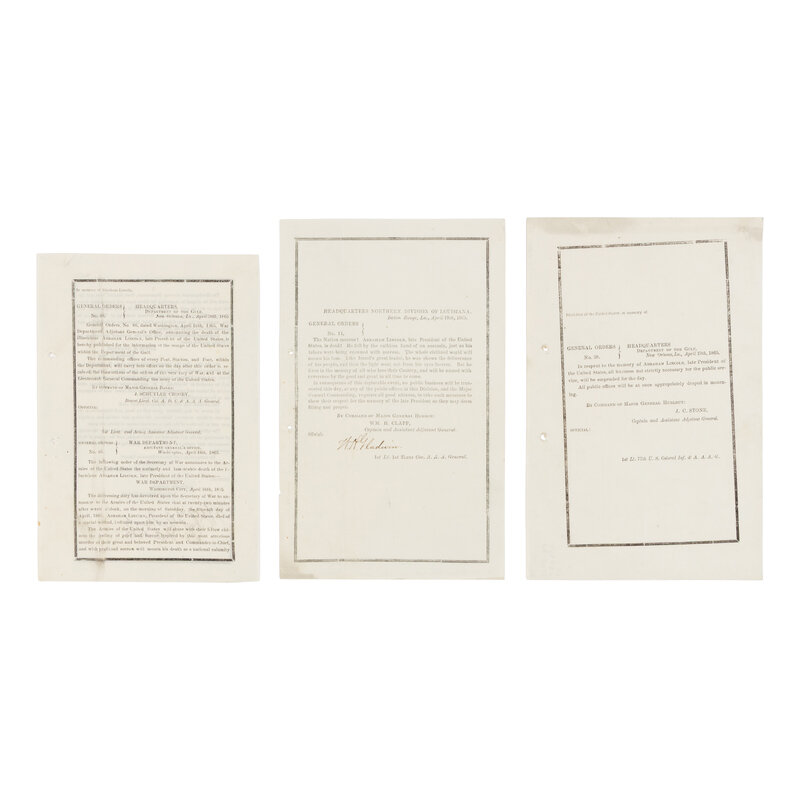 CLAPP, William H. General Orders No. 14. Baton Rouge: Northern Division of Louisiana, 10 April 1865. SIGNED BY THE OFFICIAL W.H. GLADWIN, 1st Lt. 1st Texas Cavalry. -- STONE, J.C. General Orders No. 38. New Orleans: Department of the Gulf, 19 April 1865. -- CROSBY, J. Schuyler. General Orders No. 48 [and] No. 66. New Orleans: Department of the Gulf, 30 April 1865. SIGNED ON VERSO by an Official not listed. -- Together, 3 circulars, all 8vo, each with black mourning borders, condition generally fine.