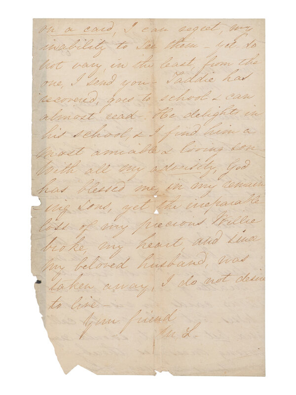 In full: "Your note of Friday is received. I see by the papers, that the carriage, is to be sold at auction in N.Y. How is this? I fear, it will bring very little, disposed of, in such a way. Is it to be taken, to Laurence's Carriage Shop, as you mentioned? As to the cards, without, they are exactly like, the same border and all of the one I send you. I wish none. As a matter of course, I am not using cards, for visiting purposes, but when visitors call, and lest servants should carry wrong messages, thereby sometimes causing offence. On a card, I can regret my inability to see them. Yet, do not vary, in the least, from the one I send you. Taddie has recovered, goes to school and can almost read. He delights in his school, and I find him a most amiable and loving son. With all my adversity, God has blessed me, in my remaining sons, yet the irreparable loss of my precious Willie broke my heart and since my beloved husband was taken away I do not desire to live."