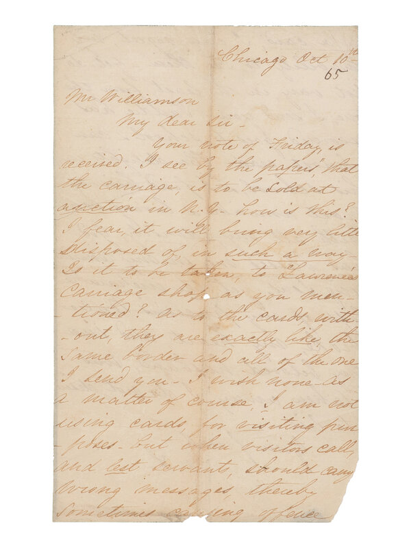 LINCOLN, Mary Todd (1818-1882). Autograph letter signed ("M.L.") to Alexander Williamson, Chicago, 10 October 1865.