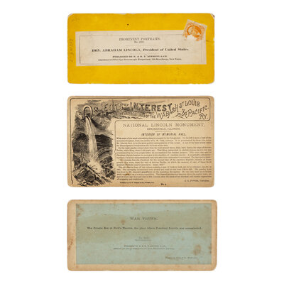 "Hon. Abraham Lincoln, President of the United States. Prominent Portraits No. 2969." New York: E. and H.T. Anthony, 1864. After a photograph by Brady. Printed label on verso. Ostendorf O-84. -- "Private box at Ford's Theatre, the place where President Lincoln was assassinated. War Views No. 3403." New York: E. & H.T. Anthony & Co., n.d. [1865]. Negative by Brady & Co. Printed label on verso. -- "National Lincoln Monument, Springfield, Illinois. Interior of Memorial Hall. No. 5." Wabash, IN: B.W. McLain & Co., n.d. [ca 1874]. From the "Objects of Interest on the Various Lines of the Wabash, St. Louis & Pacific RY."