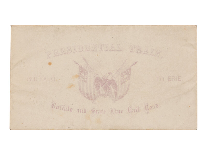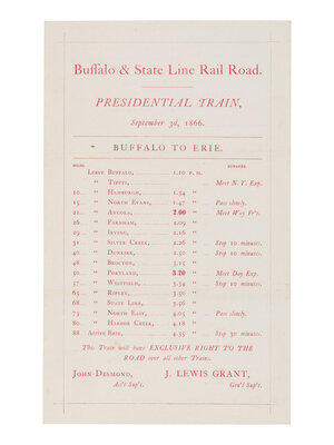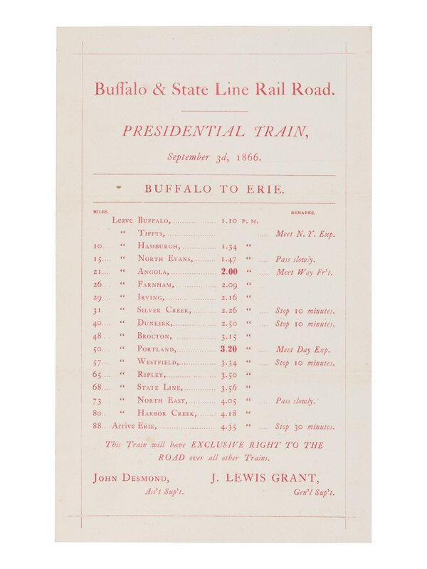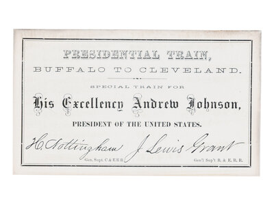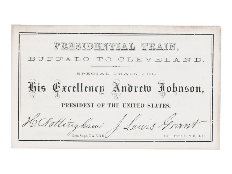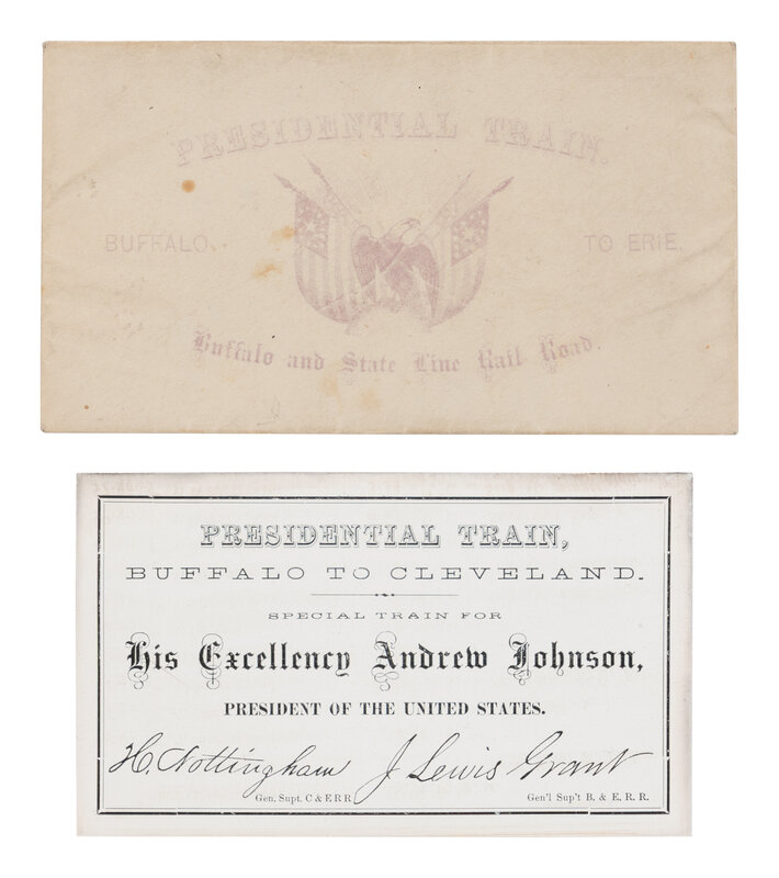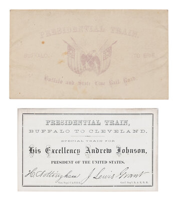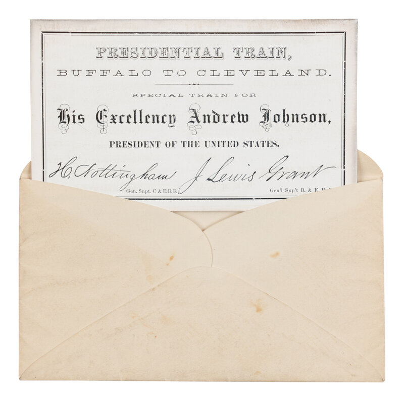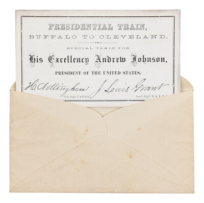 [JOHNSON, Andrew (1808-1875)]. Presidential Train schedule and pass, with the original envelope, for the "Swing Around the Circle" tour. N.p., n.p., 3 September 1866.