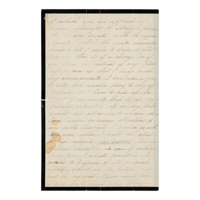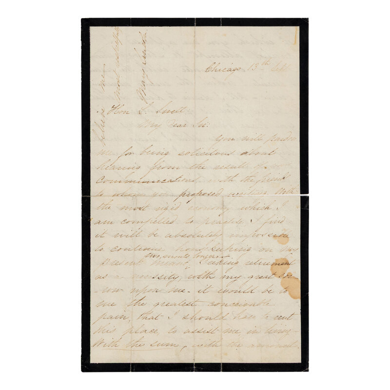 In part: "You will pardon me for being solicitous about hearing from the result of communications with the friends to whom you proposed writing. With the most rigid economy, which I am compelled to practice, I find it will be absolutely impossible to continue housekeeping on my present means two months longer. Seeking retirement as a necessity, with my great sorrow upon me, it would be to me the greatest conceivable pain, that I should have to rent this place... I can assure you, it will add another pang to my afflictions if I have to give up for want of means to keep it up - my present situation."