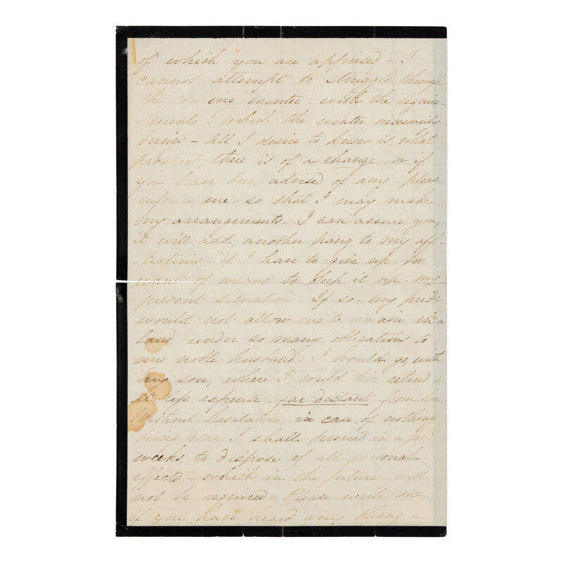 2pp., 8vo (210 x 133 mm) on black-bordered mourning stationery, folds, minor staining, partial split along fold.