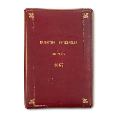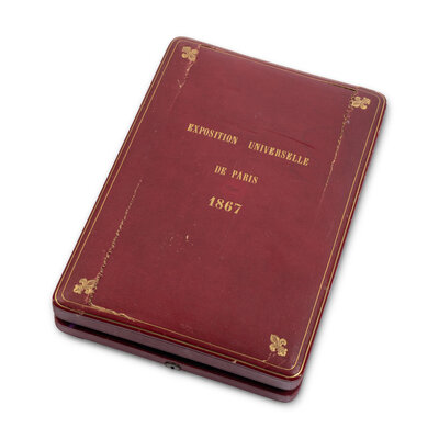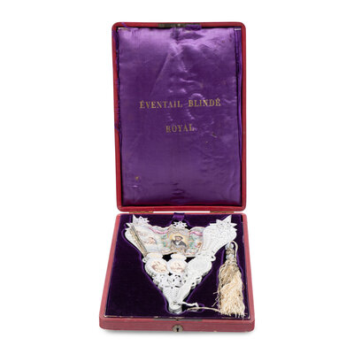 Housed in a presentation red leather box titled “EXPOSITION UNIVERSELLE DE PARIS 1867”. On the inside is a felt receptacle for the partially closed fan and the words: “EVENTAIL BLINDE [armored fan] ROYAL”.